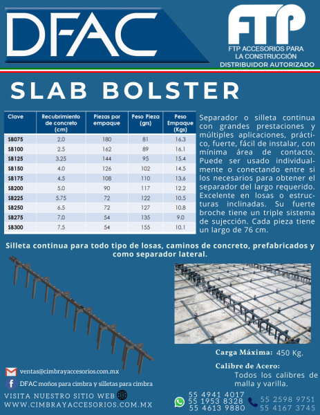 Slab Bolster es una silleta o separador continua con grandes prestaciones y múltiples aplicaciones, practico, fuerte, fácil de instalar, con mínima área de contacto. Puede ser usado individualmente o conectando entre si los necesarios para obtener el separador del largo requerido. Excelente en losas o estructuras inclinadas. Su fuerte broche tiene un triple sistema de sujeción. Cada pieza tiene un largo de 76 cm.