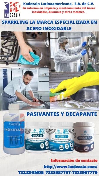 En Kodezain Latinoamericana S.A. de C.V. Te ofrece los productos de la línea SPARKLING,  los productos antes mencionados son pasivantes para el acero inoxidable de acuerdo con las normas aplicables ASTM A-967 M-13 y ASTM A-380-06. Pasivante y limpiador diseñado para limpiar toda clase de superficies de Acero Inoxidable, logrando una excelente pasivación y limpieza, además de un acabado que realza el brillo. Recuperación de propiedades originales del acero inoxidable.