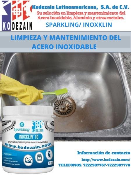 Nuestra empresa KODEZAIN LATINOAMERICANA, S.A de CV. Ofrece los productos de la línea Sparkling especializados en la limpieza y mantenimiento del Acero Inoxidable. Ayudando a la recuperación de propiedades originales del acero inoxidable, resalta el brillo, elimina contaminantes acumulados y adheridos a la superficie tales como: polvo, huellas de dedos, manchas de alimentos, grasas ligeras, derrames de líquidos y sustancias, manchas de agua (incrustaciones de cal profundas), decoloraciones por calor, depósitos de carbón, manchas de ácidos y en general cualquier contaminante difícil de limpiar